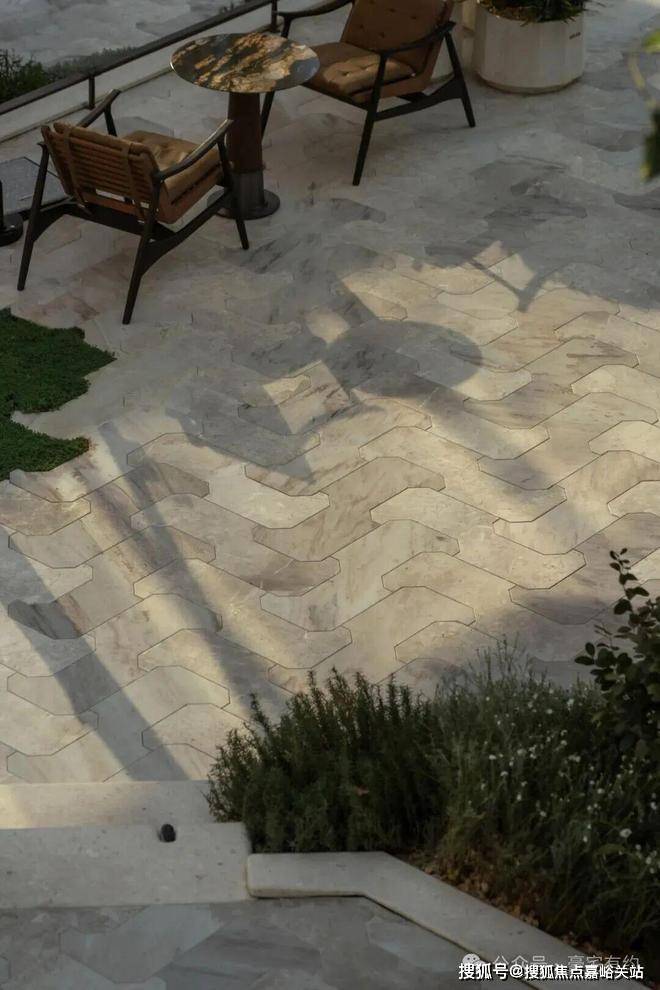 铺装延续柔和基调,米灰调石材温润而富有细腻变化,营造出高级的材质感受。图案上,景观转译了建筑的八边形语汇,通过现代手法将其咬合搭接,既延续了装饰艺术的基因,亦增添了一分时髦的未来气息。
