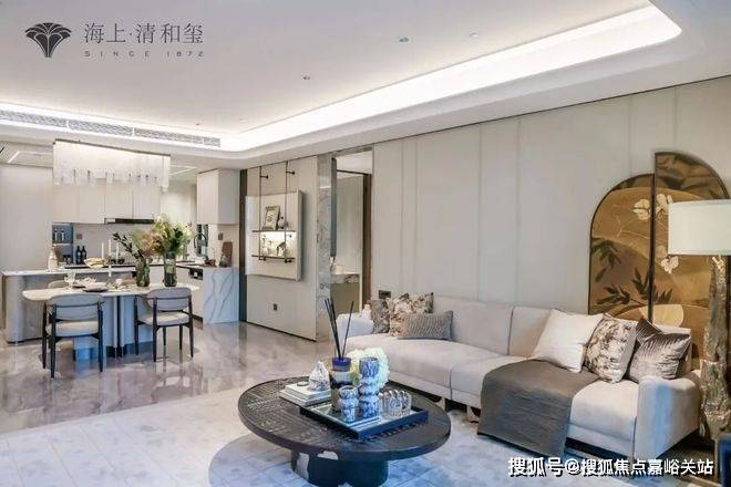 ☑️☑️海上清和玺售楼处电话:400 - 8377 - 020☑️☑️电视背景墙采用卡慕白的石材+皮革造型,弧形吊顶,相当讲究,连空调出风口的形状都打造为海上·清和玺logo山茶花的形状~~三大件为大金(或同等档次)中央空调和地暖,新风系统为百朗(或同等档次),南向阔景阳台,采光视野一级棒!☑️☑️海上清和玺售楼处电话:400 - 8377 - 020☑️☑️