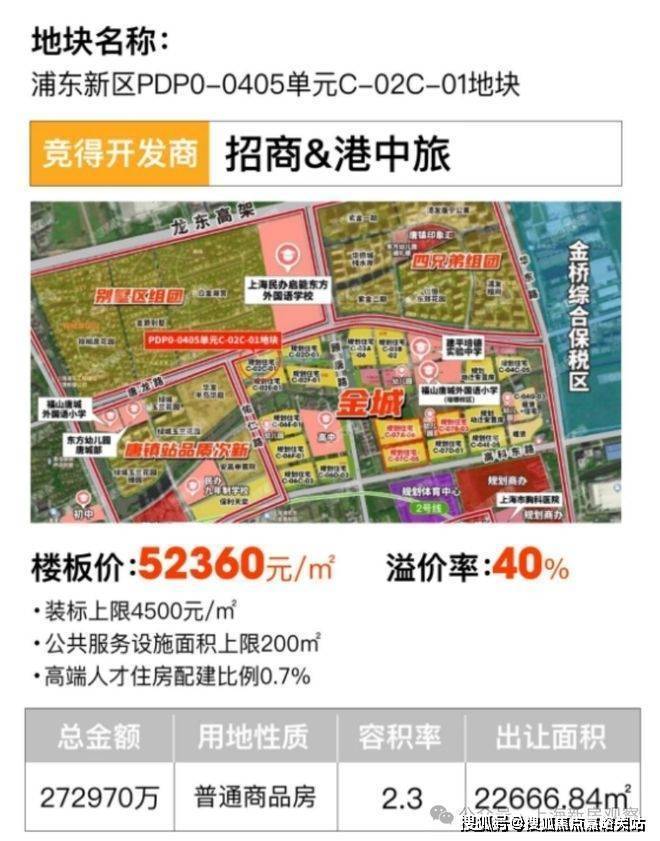土拍重磅新闻——7月25日上海六批次土拍结束,唐镇地块再次赚足市场眼球!经过62轮鏖战,最终由招商&港中旅以总价27.3亿,楼面价5.24万元/m²夺得!溢价率突破40%!!!未来售价预计将突破9万/m²,已迎来价值爆发窗口期!