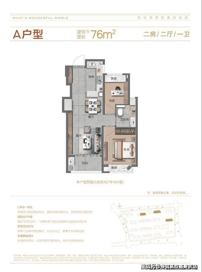 连建面约76㎡2房都能做到创新分户S墙,市面罕见,内嵌收纳,也可将冰箱外移,释放厨房空间,营造合理餐厨动线。