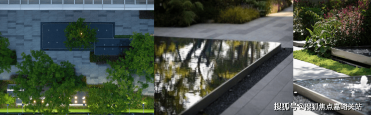 社区内部景观通过大面叠级水景为中心,搭配普拉达绿大理石和浪淘沙石材,奠定整体空间的高雅基调。