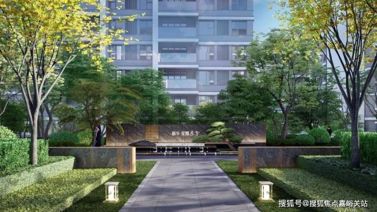 以多种名贵植物的阵列形式,打造星级酒店式入户门仪,同时高层及洋房单元入口更设有约0.9m的高景墙,沉稳质感,营造摩登奢雅的尊崇体验。