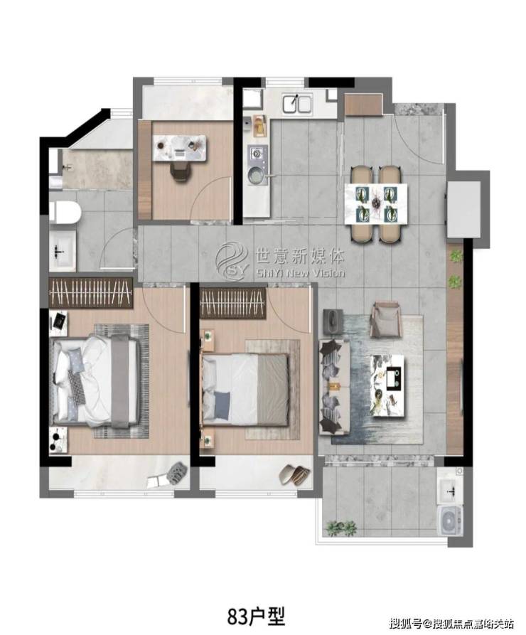 象屿深入考量空间与场景的运用,将生活中看得见与看不见的细节进行了细致打磨。玄关、阳台、厨房、卫浴均设置科学收纳空间,营造高品质生活体验的同时,更带给居者层建面约83㎡3房2厅1卫