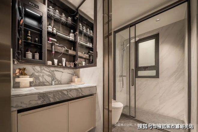 同时玄关柜底部也特意做了镂空,可以摆放拖鞋、换洗的鞋子、摆放扫地机器人等都很实用。卫生间收纳也是相当出色: