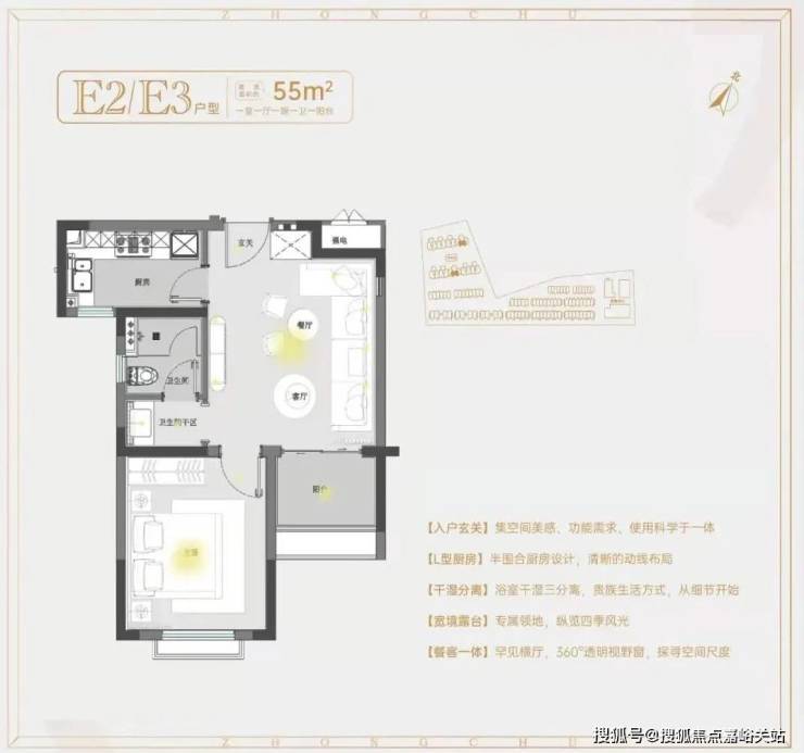 建面约55㎡1房1卫户型,低总价优质上车小户型,做到了双开间朝南+卫生间干湿分离+卧室带飘窗+客餐厅相连,小而美的一个户型。