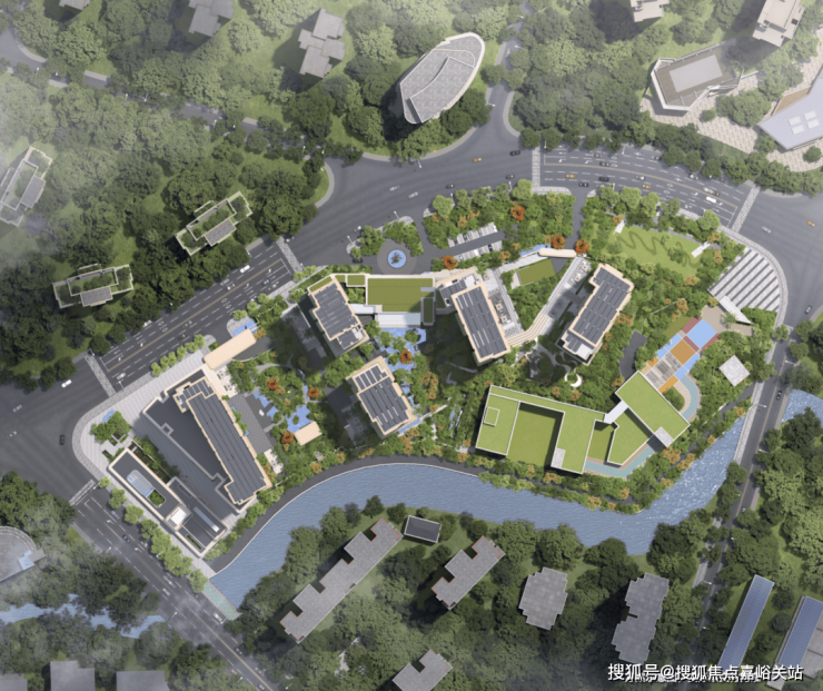 步入社区的第一重仪式感,始于社区整体抬升约1.3-1.4米的“玉盘托珠” 格局。设计师以精妙的地形重塑,将河道景观化为私家长廊,形成天然的视觉屏障与观景台。