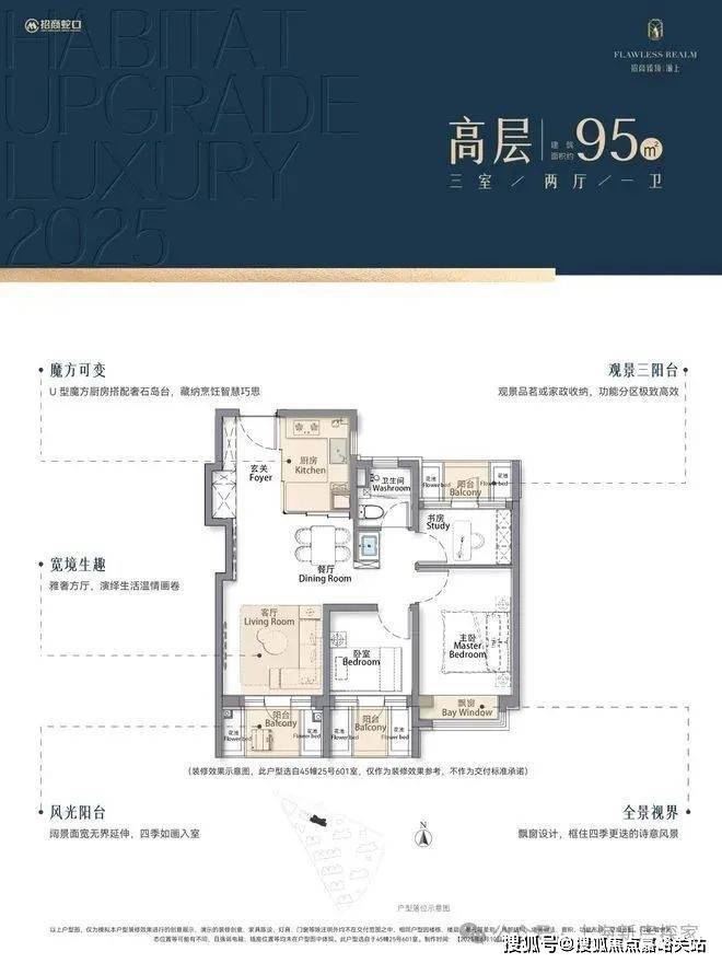 再加上南向大面宽短进深、全卧飘窗、L型转角阳台设计,哪怕小户型95㎡3房,尺度感都超棒,采光和视野更是一流。