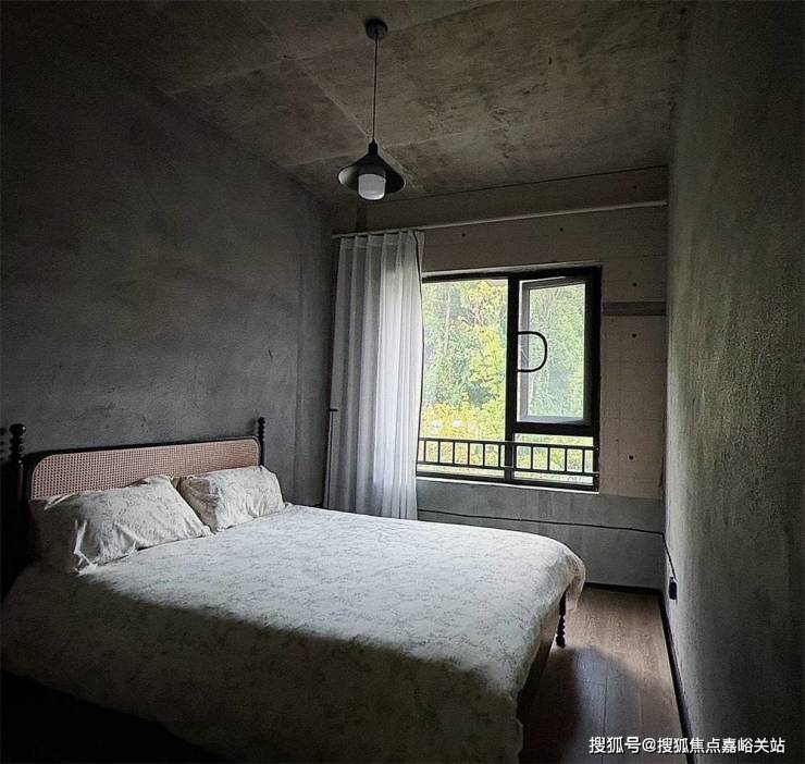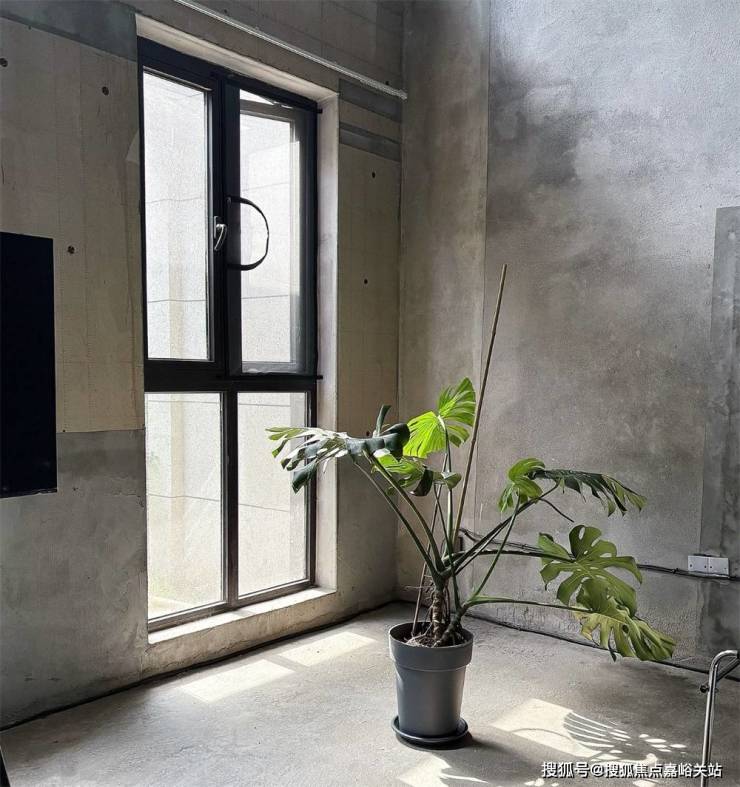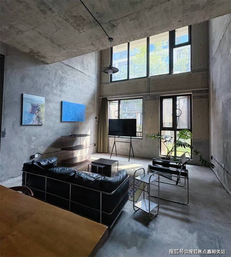 距离更远的窗户下方直接放支架电视,因为是一楼,窗外还有个小小的草坪院落,坐在沙发上望着窗外绿意盎然,仿佛屋内的毛坯房风格也不那么冰冷无趣了。