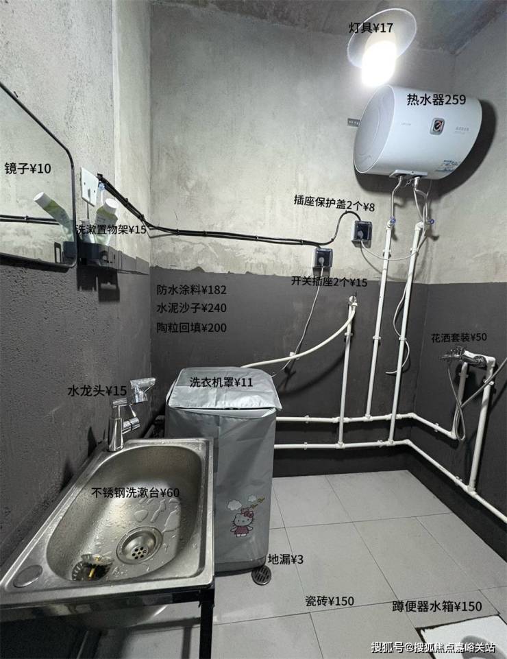 卫生间都刷了1米8高的防水,但电线和水管都没有埋藏而是明装,热水器也选了小小的一个,足够日常洗漱使用。