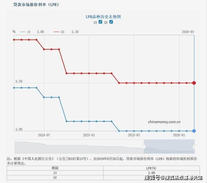 3月20日,中国人民银行授权全国银行间同业拆借中心公布,2026年3月20日贷款市场报价利率(LPR)为:1年期LPR为3.0%,5年期以上LPR为3.5%。以上LPR在下一次发布LPR之前有效。