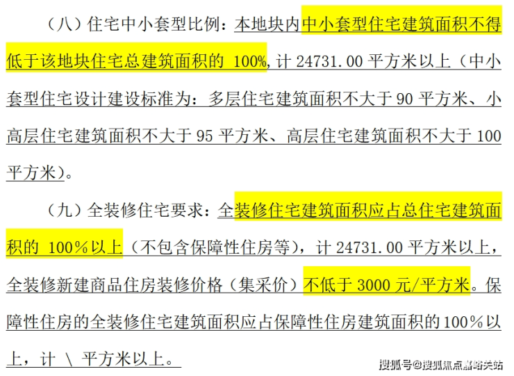 装标不低于3000元/平,中小套比例不低于100%,全装修比例为100%。