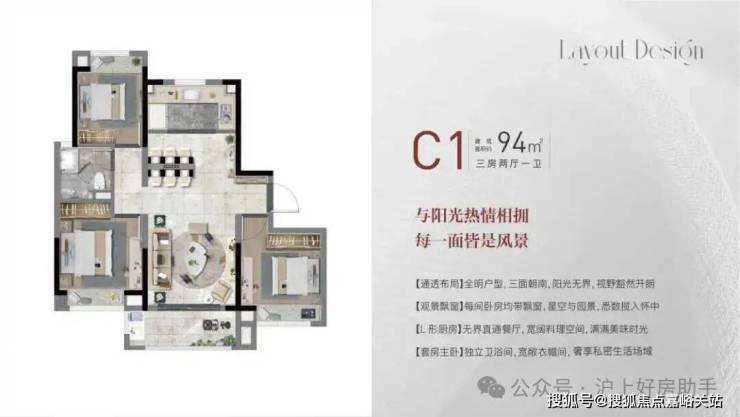 客餐厅相对独立,客厅+次卧南连约6.7米宽景阳台,餐厅北连大飘窗,层高3米,室内空间尺度瞬间体现出来;