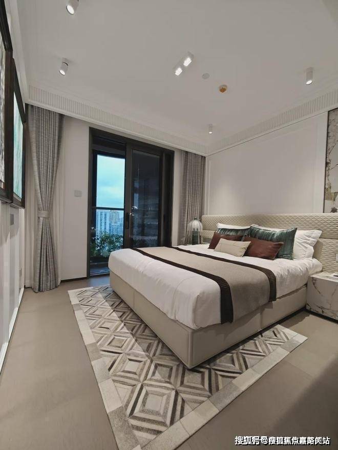 卧室有多间,装修也延续了精简的理念,双人床配床尾沙发,再加两组床头柜,毕竟是300㎡叠墅,有专门的衣帽间,不必考虑衣柜的位置,卧室会更显宽敞。
