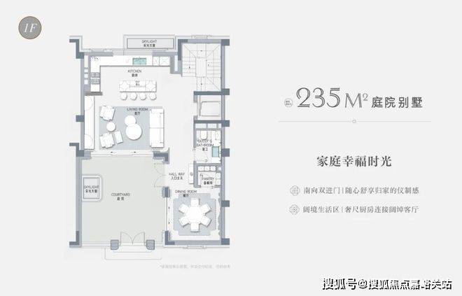 以建面约235㎡的庭院别墅样板房为例,户型附赠地下室、庭院、露台、阁楼空间,附赠面积达到户型总建面的60%左右,市场上少之又少!
