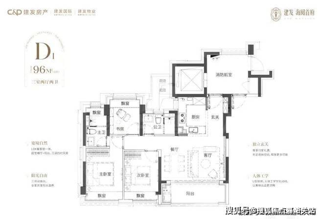 另一套建面约100㎡飞机户型,同样做了三房两卫,建发海阅首府24小时vip热线电话:400 - 882 - 4258
