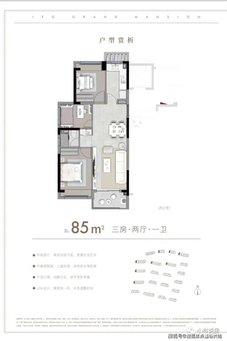 户型解析: 约85㎡的3房,这种入门级的产品也要保证居住的尺度感。比如利用L形厨房与餐厅相连接,一体化的设计让空间充足利用。比如次卧连接阳台,就是人性化考虑到给他们一个私密的追光天地。
