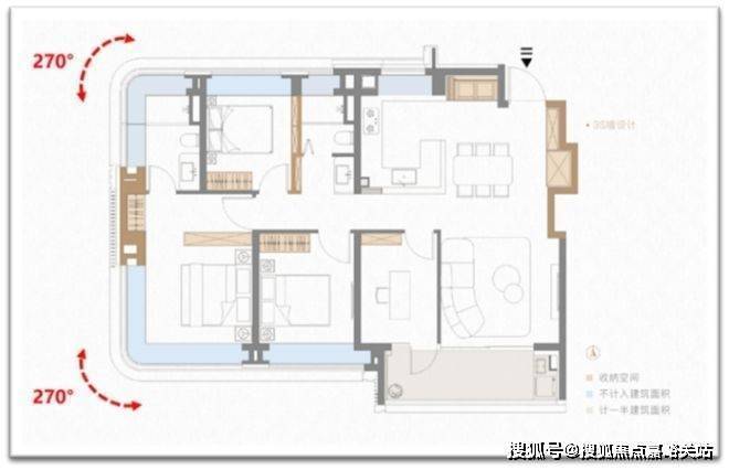 第三处山墙s墙的技术含量更高,直接让户型拥有两个大转角飘窗(主卧+主卫均双270°弧形转角飘窗)。凹处填放一个衣柜,视觉效果舒适,业主第一眼无知无觉,殊不知背后大有玄妙。