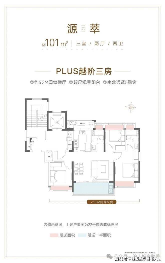 建面约101㎡3房2卫户型,非常标准的飞机户型。