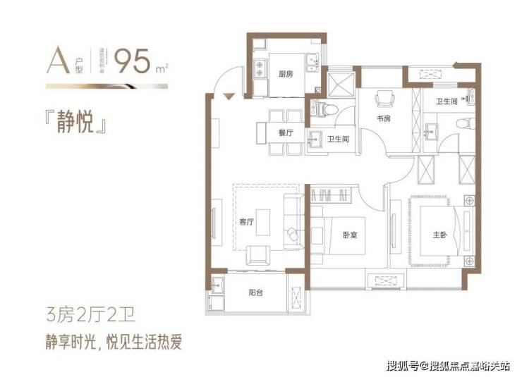 『静悦』约95㎡3房2厅2卫:三开间向阳户型,面朝风景,沐浴阳光;全明通透,让阳光照进每一寸惬意生活;户户飘窗,逐光而居,延伸空间尺度;全明卫设计,赋予私密空间明亮与清新;。方正有序的空间艺术,舒适实用,张弛有度