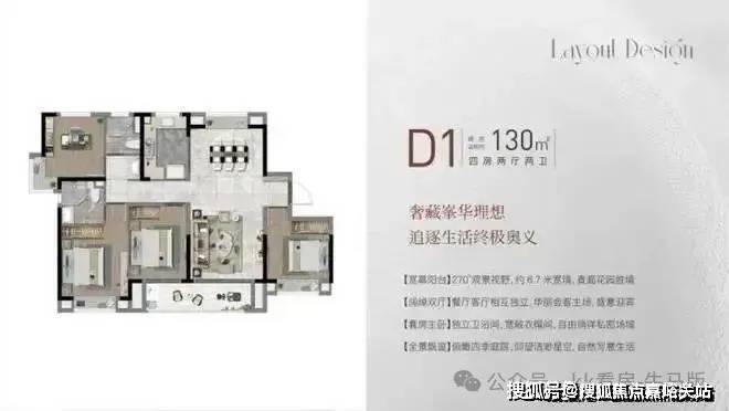 建面约130㎡4房2厅2卫,做到了四开间朝南+南北通透+主卧套房设计+双阳台设计+卫生间干湿分离,“一步到位”大4房,空间尺度非凡。