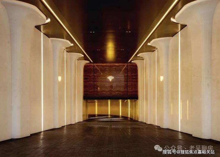 6、 社区含“奢材”量很高。门庭延街的外立面,以精工定制弧形 米色石材为主调,镶嵌典藏级 老虎玉大理石,点缀 古铜色现代海派艺术感灯器,整体呈现出百年海派的贵雅气质。