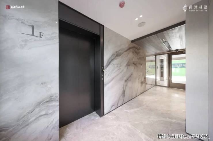 进入内部是灰色大面铝板搭配金色格栅,电梯厅墙面则铺设大面积岩板,吊顶也颇具设计感。