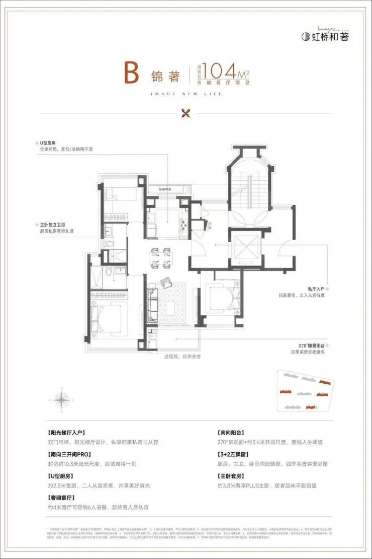 建面约104㎡3房,在建面94㎡小3房优点上,又进一步升级了尺度感,约10.3m的南向面宽,为室内带来了出众的采光面和尺度感,保利虹桥和著售楼处电话➡☎:400 - 8824 - 258【24小时预约快线】这个户型无论从实用性、尺度感,亦或是视野、采光、私密性来说,都做得相当优秀。