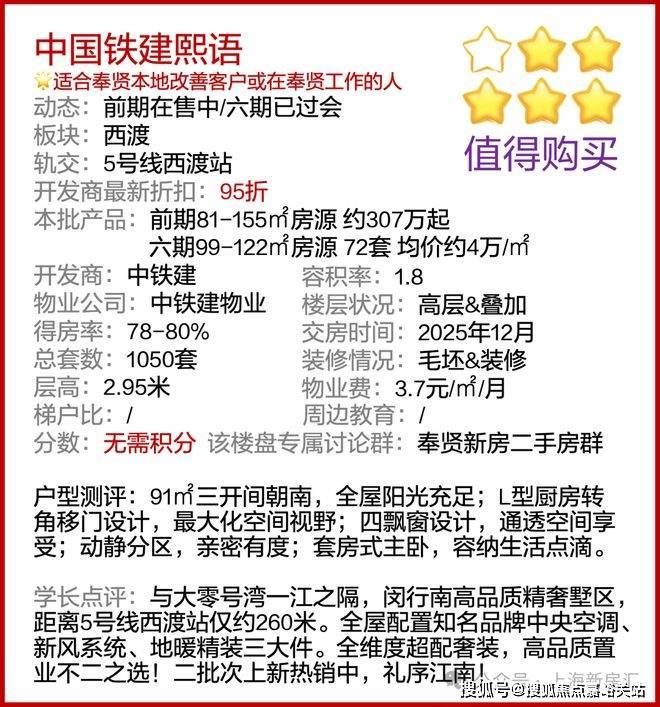 最新消息,奉贤西渡「中国铁建熙语」六期已过会!推出建面约99-122㎡房源,共计72套,均价约4万/㎡!