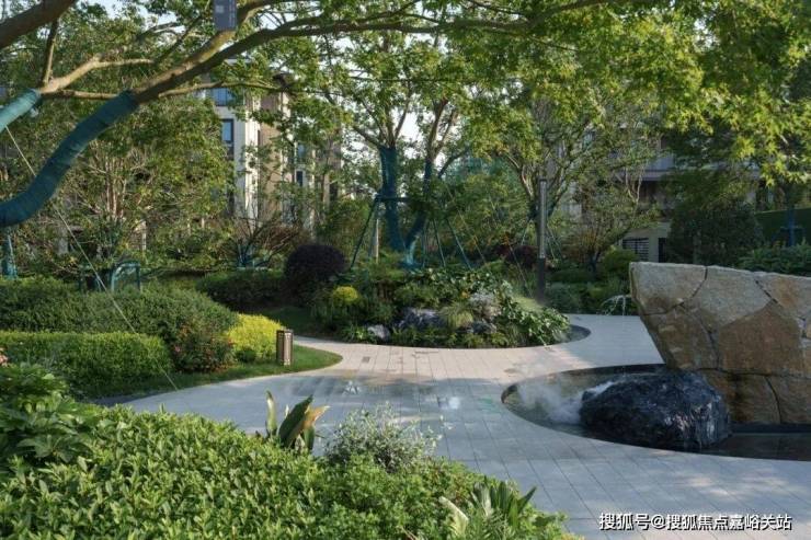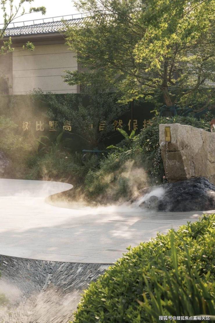 弧形毛石景墙以自然粗犷的肌理与精致金属细节相映成趣,蜿蜒的浅灰色步道在绿意盎然的植被簇拥下向前延伸。景墙底部涌泉潺潺,清澈的水声与周边绿植的沙沙声交织成自然韵律,营造出宁静而充满仪式感的归家氛围。