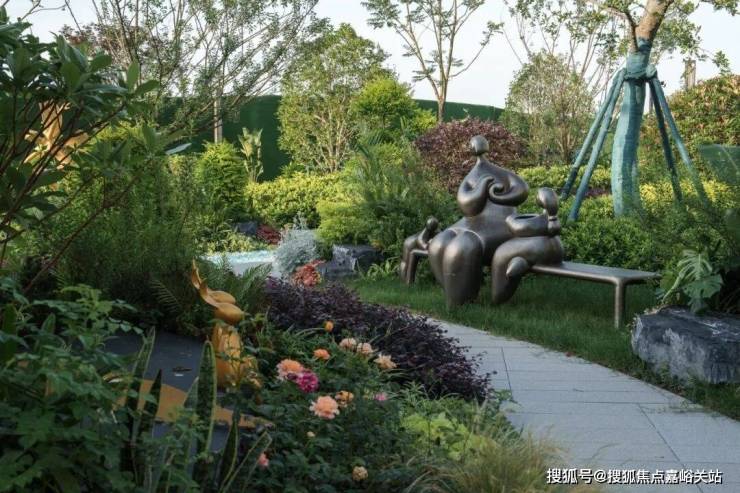 环绕雕塑的留白草坪犹如天然绿毯,蜿蜒的浅色小径如丝带般穿过草坪,连接各个功能区域。近处龟甲冬青、火焰南天竹等彩叶植物形成缤纷色带,与雕塑的金属光泽构成巧妙对话。这片开放空间既如自然绘就的立体画卷,更似社区中心的活力客厅,在艺术与自然的交融中,孕育着无限的生活可能。