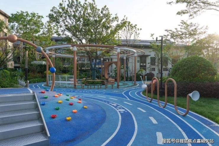 全场地被香樟、灌木等绿植环抱,树冠提供天然遮荫,蕨类地被植物软化边界。蓝色“海面”上漂浮着“悦动Life”“VIP”等文字岛屿,更设白鹿雕塑、秋千等趣味元素,让各年龄段儿童在安全挑战中感知海洋主题的活力与浪漫。