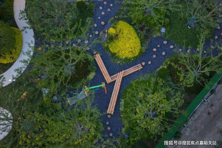 通过地形高差与跌水造景模拟峡谷地貌,倾斜绿岛立面种植耐阴蕨类,路径蜿蜒曲折,激发探索趣味,是一处自然课堂,让孩子们在游戏中感知生态。