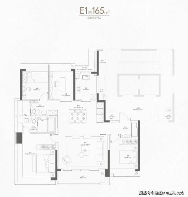 188户型2梯2户,有独立的电梯厅。4房3卫设计,还是3明卫,这两点还是不错的。