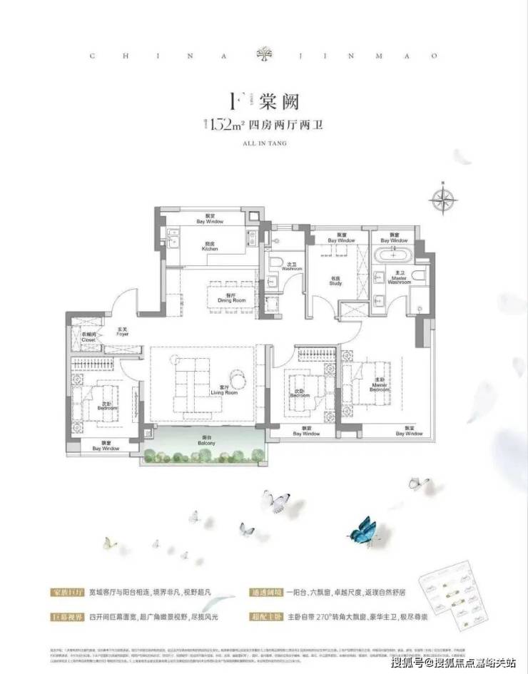 建面约117㎡3房2厅2卫,做到了3+1开间朝南+5个飘窗+主卧套房设计+270°转角飘窗,所有的尺度都有进一步提升。