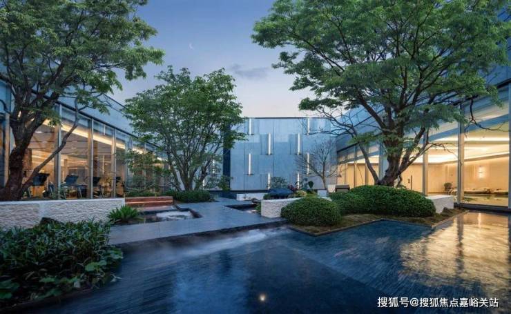 会所还拥有 下沉水景庭院,与周围建筑融为一体,以静水、原石、浮桥、古树、自然微地形为精神媒介,将自然与松弛感带给社区。