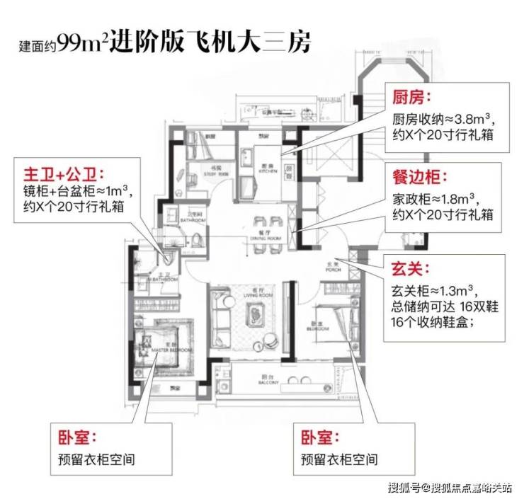 主力建面约99㎡3房产品,非常标准的南北通透飞机户型,整个室内几乎无走道,空间0浪费。