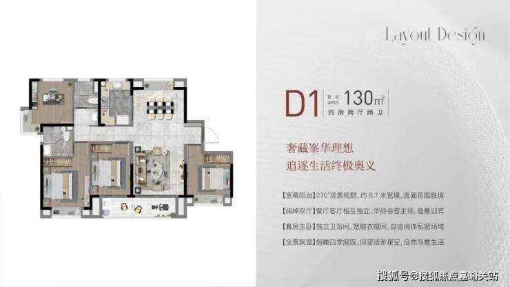 建面约130㎡4房2厅2卫,做到了 四开间朝南+南北通透+主卧套房设计+双阳台设计+卫生间干湿分离 ,“一步到位”大4房,空间尺度非凡。