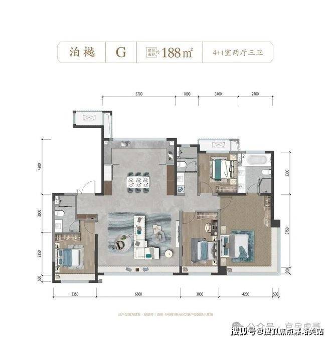 188平米是南向四面宽,入户有玄关,避免入户见厅。南向双套间的设计,客厅面宽6.6米,主卧是套间,且是270°的飘窗,主卫增加了双台盆和浴缸的设计。