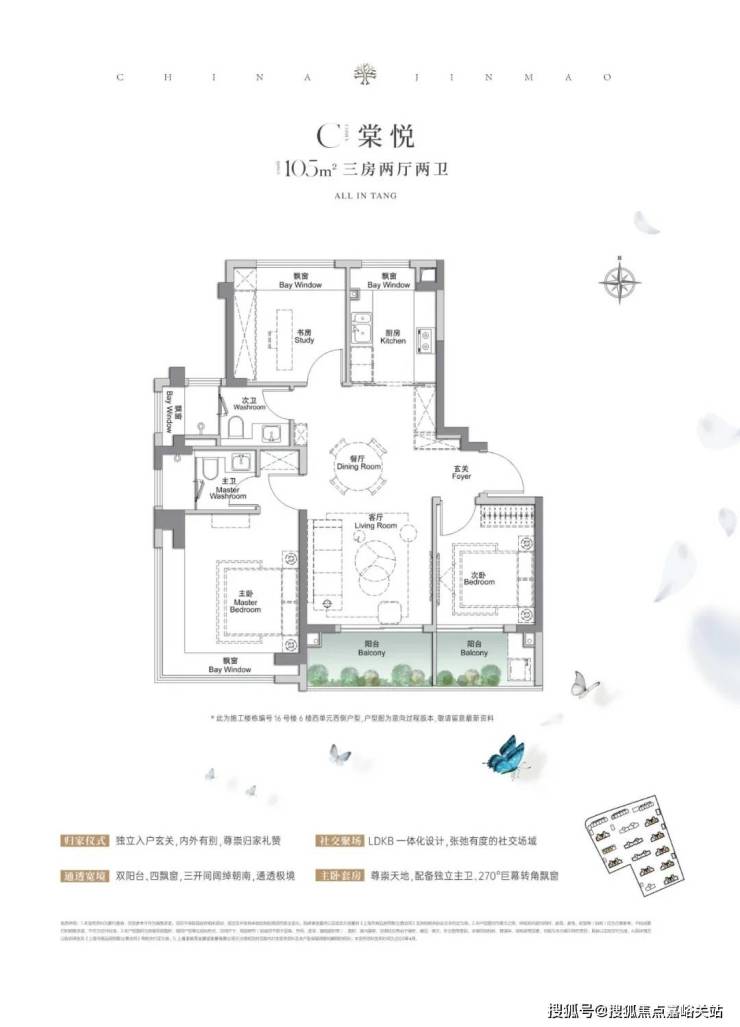 建面约105㎡3房2厅2卫,做到了 三开间朝南+4个飘窗+双面阳台系统+主卧套房设计+270°转角飘窗 ,附加空间非常多。