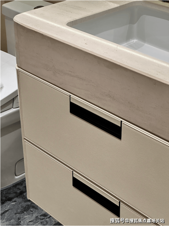 卫生间下柜同样是皮革包裹交付,标配智能马桶盖板: