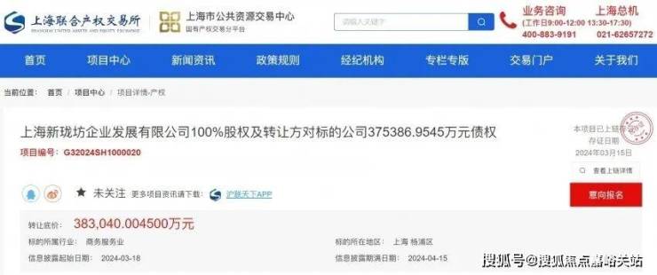 3月15日,上海联合产权交易所官网发布信息,上海新珑坊企业发展有限公司100%股权及转让方对标的公司375386.9545万元债权正式挂牌转让,其中转让方上海新珑坊企业发展有限公司由上海杨浦城市更新建设发展有限公司(下称“杨浦城更”)100%控股,杨浦成更所属集团为上海地产(集团)有限公司。