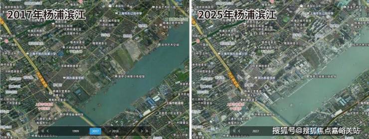 作为黄浦江畔的压轴板块, 杨浦滨江的建设速度是有目共睹的,下图是2017-2025年杨浦滨江的卫星影像变化图,几乎是一年一个样!