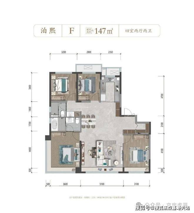 127平米的是四叶草户型,也是二期的主力户型。南向三面宽,客厅的面宽在4.1米,主卧的面宽在3.6米,次卧的面宽3米,三个功能空间的都是飘窗的赠送。