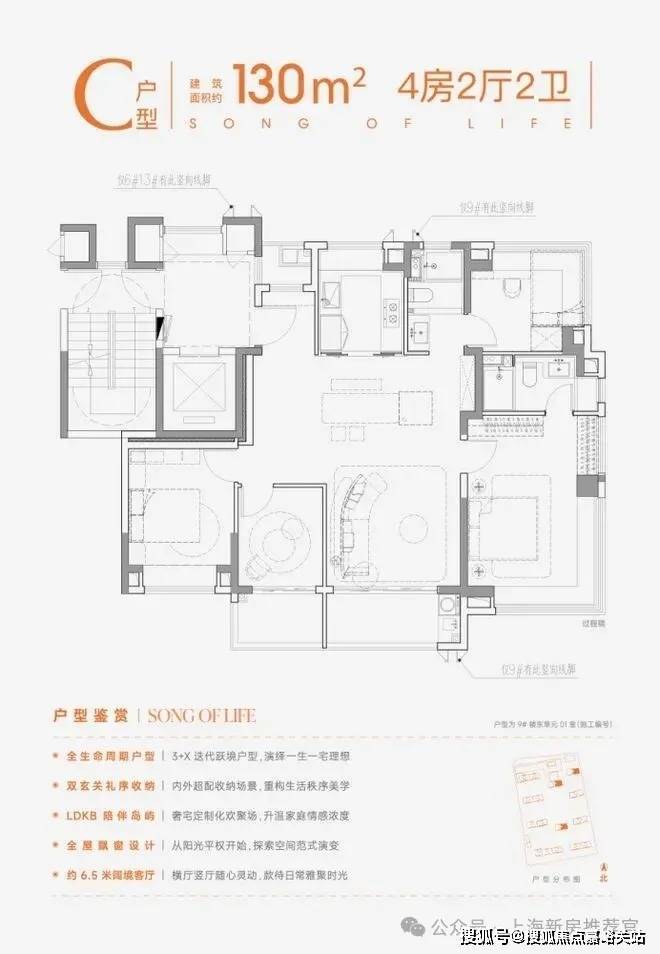户型普遍采用南北通透、全明格局,并创新性地引入了“类一梯一户”设计、南向双阳台、270°转角飘窗等元素,显著提升了空间的采光、通风、实用性和仪式感。