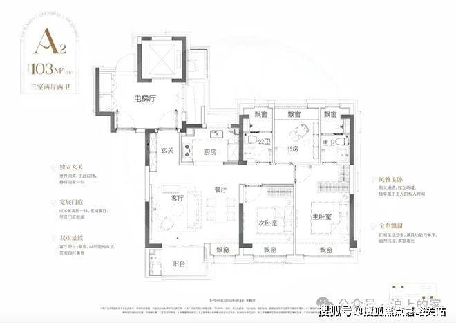 海阅首府售楼处电话:4008569058✔✔✔103㎡该户型同样是三开间+大横厅的布局,但主卧尺度更进一步,能够隔出一个大衣帽间和化妆间!全屋享有5个飘窗+南向观景阳台,连餐厅区域也自带南向飘窗,大大提升居住舒适度!海阅首府售楼处电话:4008569058✔✔✔