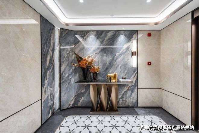 精致的迎宾水景、苍劲滴翠的罗汉松,为城市的界面,增添一抹亮色,也让当代年轻人,在享受现代都市生活的同时,感受到家的温暖和亲切。蓝翡翠的奢石,以深邃幽远的尊蓝色基底,尽显光彩下的神秘奢华;而顶部异形的仿铜星空顶设计,用香槟金色斜角造型铝板搭配熠熠灯光,碰撞出科技与艺术的美学。