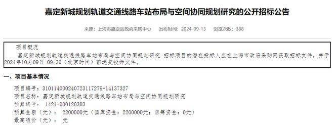 9月13日,上海政府采购网发布《嘉定新城规划轨道交通线路车站布局与空间协同规划研究的公开招标公告》。