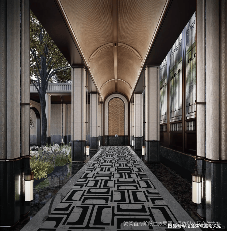 继续向里走, 廊道内可见经典的石材立柱、拱形的吊顶、PRADA荣宅的手绘彩玻、繁花的地面拼花等用材工艺,移步异景间,是别样的摩登魅力✅ 建发海阅首府售楼处电话:400-1183-708✅。