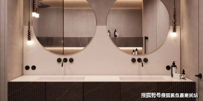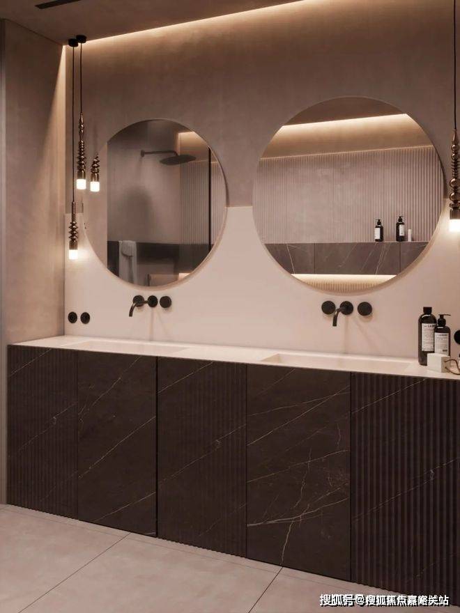 卫生间宽敞而明亮,摈弃过多的射灯或主灯,而是沿用部分照明灯具,立面的装饰线条参差不齐却独有韵味,深色大理石柜体压低了空间的调性,让空间的层次轻重分明。售楼处电话:400-118-3159
