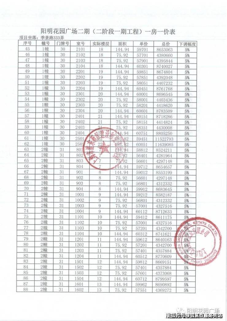 一房一价表如下